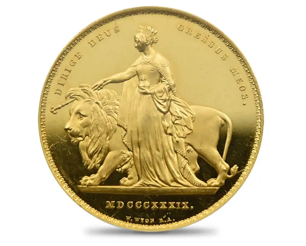 世界一美しい金貨は、1839年イギリス ヴィクトリア女王即位記念 ”ウナとライオン” 5ポンド金貨