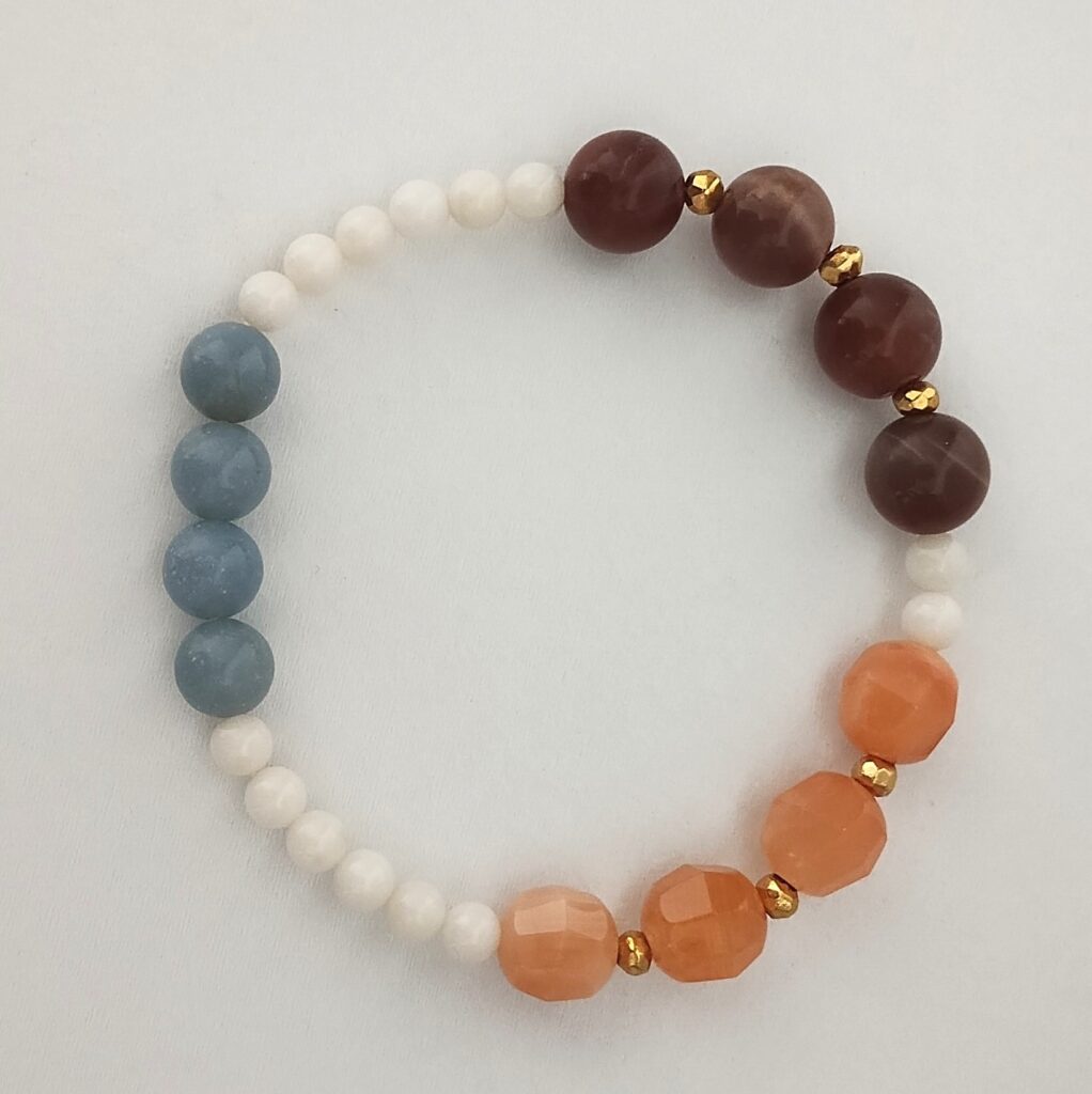 優しい天使の波動を持つエンジェライト(ブルーグレーの石)、女性の感性を整えるブラウンムーンストーン、そして前向きな幸運を呼び込むオレンジベリル。