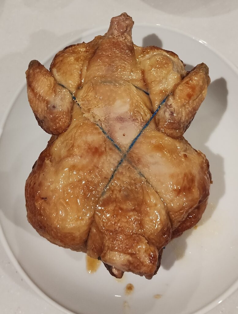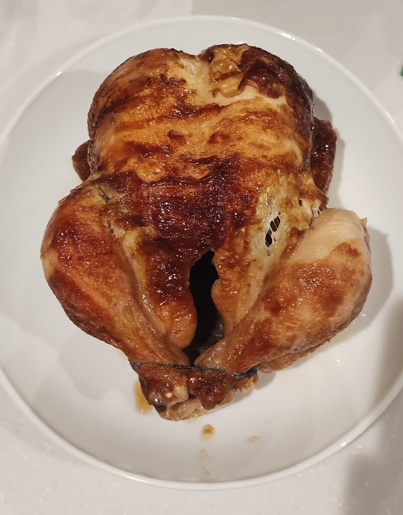 丸ごと焼かれた鶏は、皮は香ばしく、むね肉とささみはさっぱり、もも肉や手羽はジューシーです。